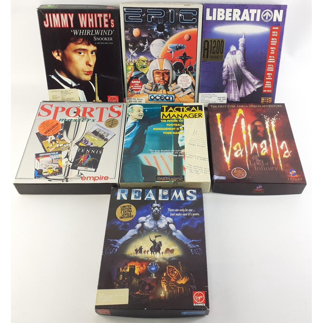 Seven AMIGA games comprising EPIC, LIBERATION, JIMMY WHITE WHIRLWIND, VALHALLA, TACTICAL MANAGER, SPORTS MASTERS, REALMS,