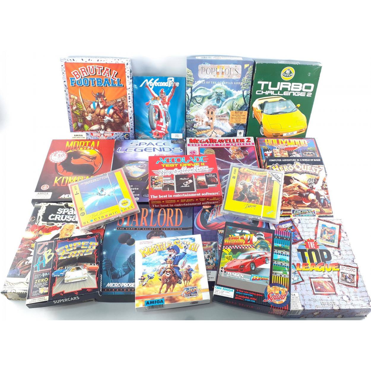 Twenty boxed AMIGA games to include The HOLLYWOOD COLLECTION, HERO QUEST, MEGA TRAVELLER 2, TURBO CHALLENGE 2, POPULOUS, BRUTAL FOOTBALL, STARLORD, SPACE CRUSADE, MORTAL KOMBAT, plus various racing games, flight games.