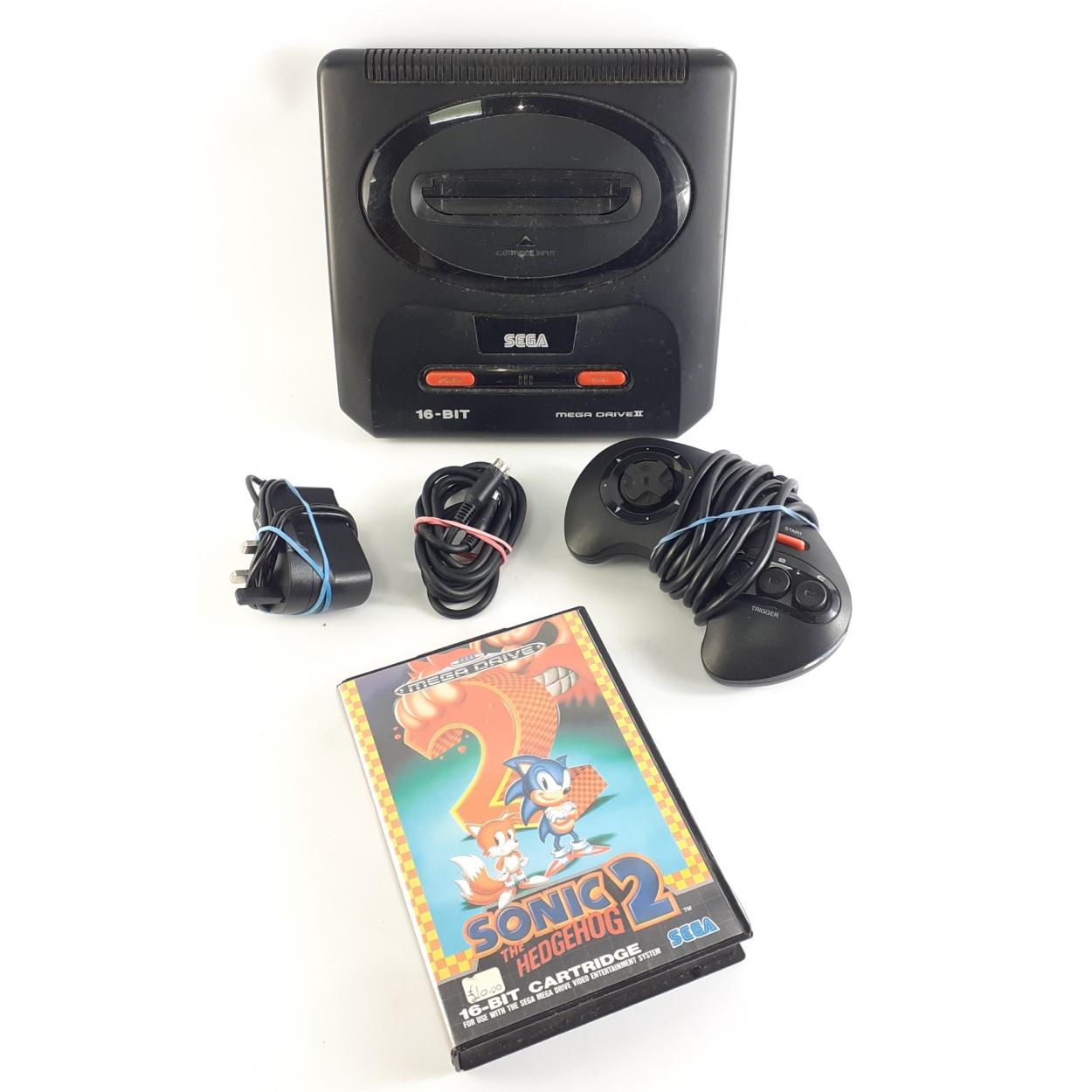 A SEGA MEGA DRIVE II 16-Bit, model no MK-1631-50 serial no 430304126. Comes with one controller, a power adapter, and SONIC THE HEDGEHOG II in its original box. Untested.