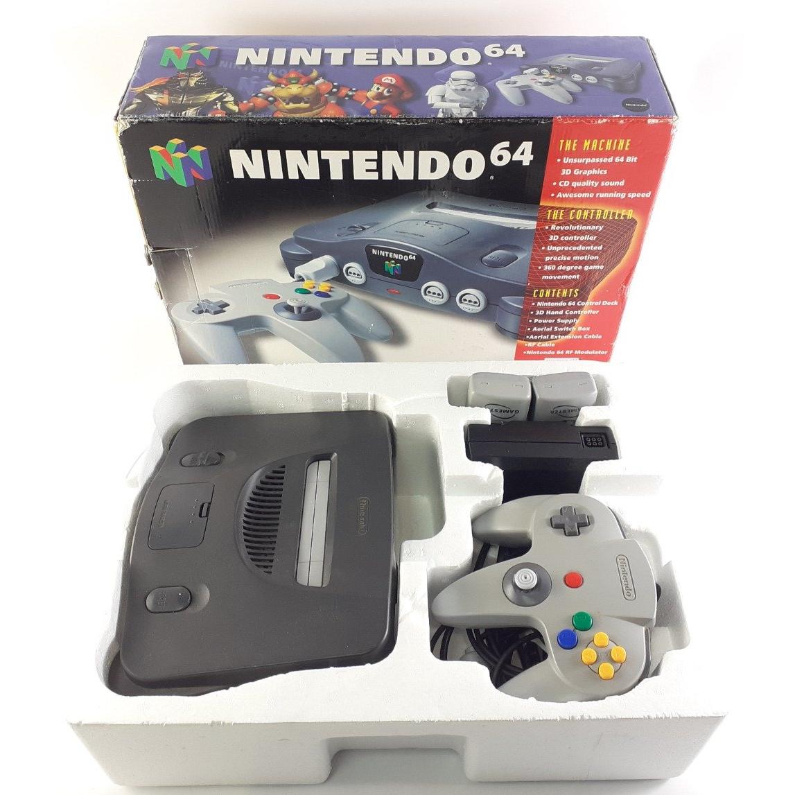 A NINTENDO 64 in original box, with controller, power leads, 2 memory sticks. Model no. NUS 001