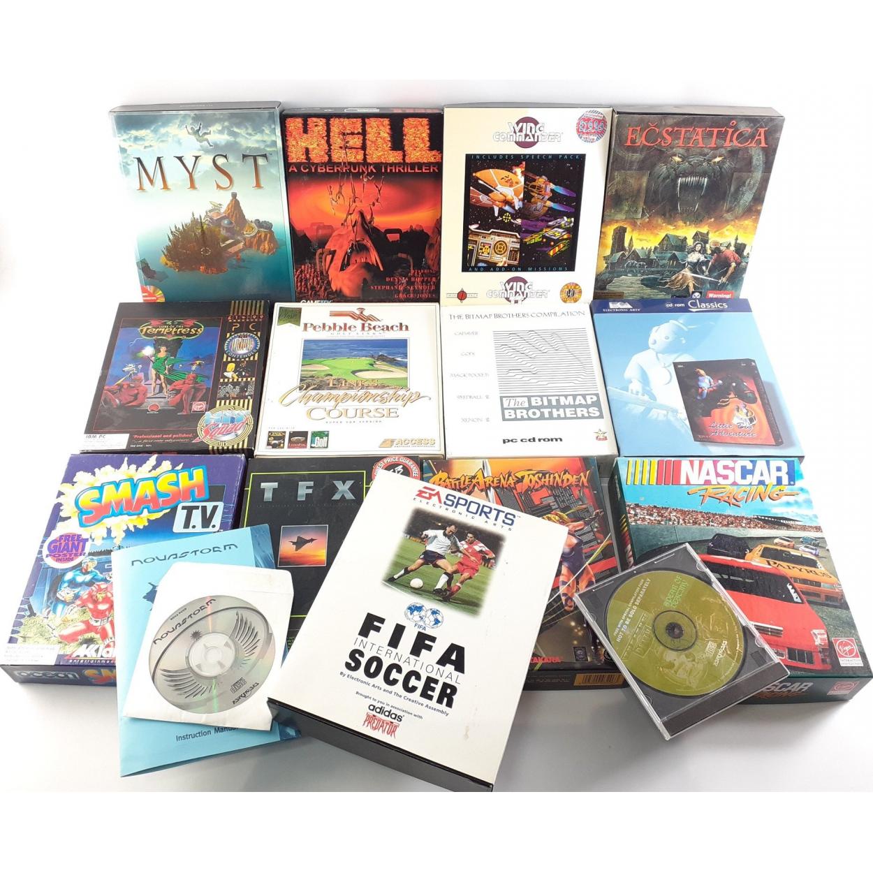 A good collection of PC games to include HELL A Cyberpunk Thriller, MYST, TFX, NASCAR RACING, PEBBLE BEACH GOLF LINKS, WING COMMANDER I & II, ECSTATICA, BATTLE ARENA TOSHINDEN, YOUR LIFE, LITTLE BIG ADVENTURE, THE BIT MAP BROTHERS COMPILATION.