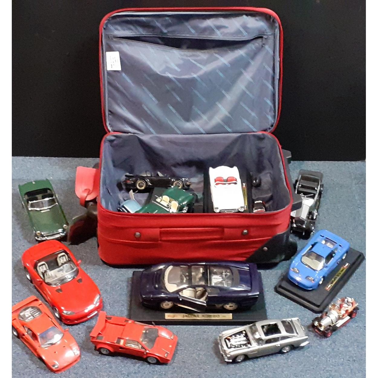 A suitcase with a quantity of Diecast model cars. Includes MAISTO Jaguar, BURAGO, FRANKLIN MINT, modern Chitty Chitty Bang Bang and much else. All unboxed.