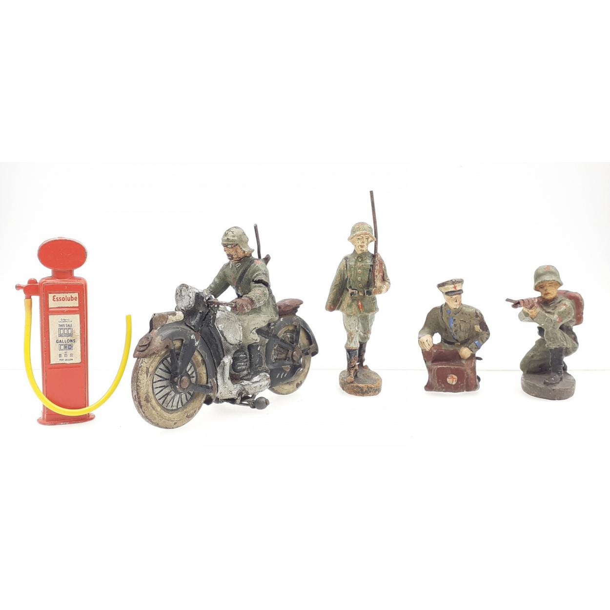 Four ELASTOLIN, DURO and other German infantry models to include motorcycle dispatch with metal frame and wheels, ELASTOLIN stamped marching soldier, DURO kneeling soldier and unmarked medics. Scarce pieces.