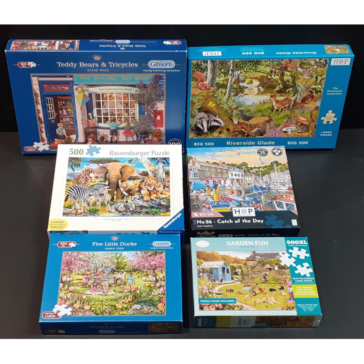 Get ready for the long winter nights. JIGSAWS 500 piece x 5. Mary's Little Lamb, Puss in Boots, Ruling the Roost, Puffin Parade and Country Living. All jigsaws have been checked and are complete and in good condition.