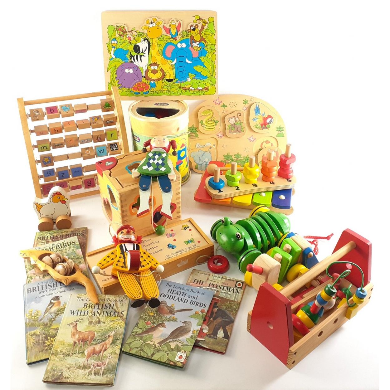 A box of CHAD VALLEY and other toys. Wooden puppet, Xylophone. Early Learning etc. In good condition.