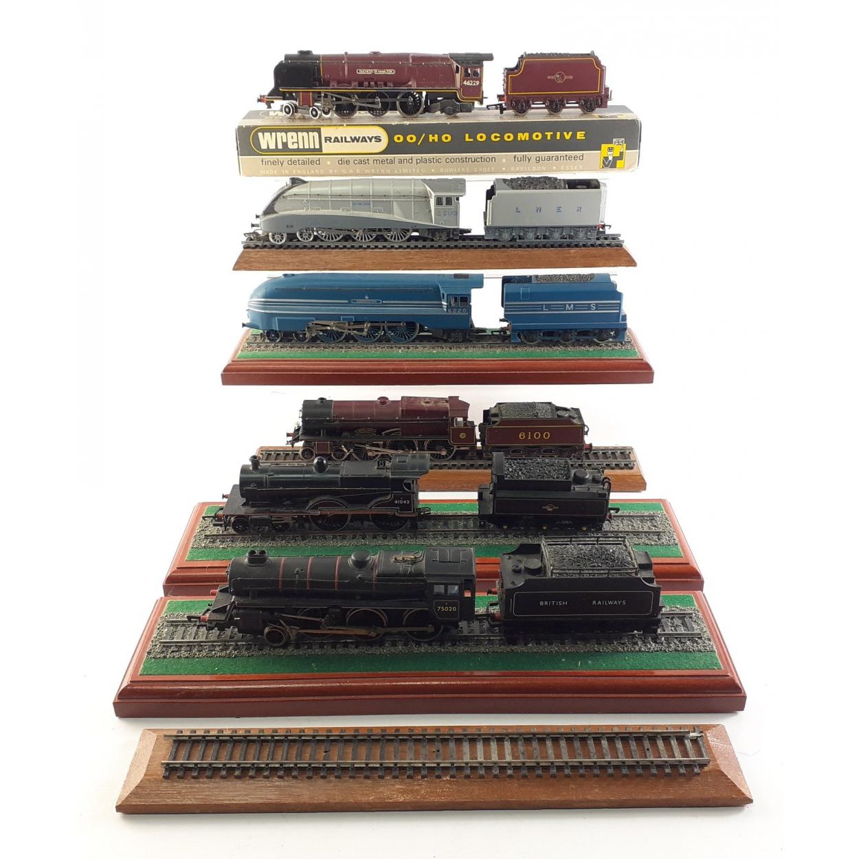 A box of model railway layout rolling stock including boxed WRENN Duchess of Hamilton, RR Royal Scot, Hornby Coronation Scot and other. With rail plinths for display. Note all with wear from use and display.