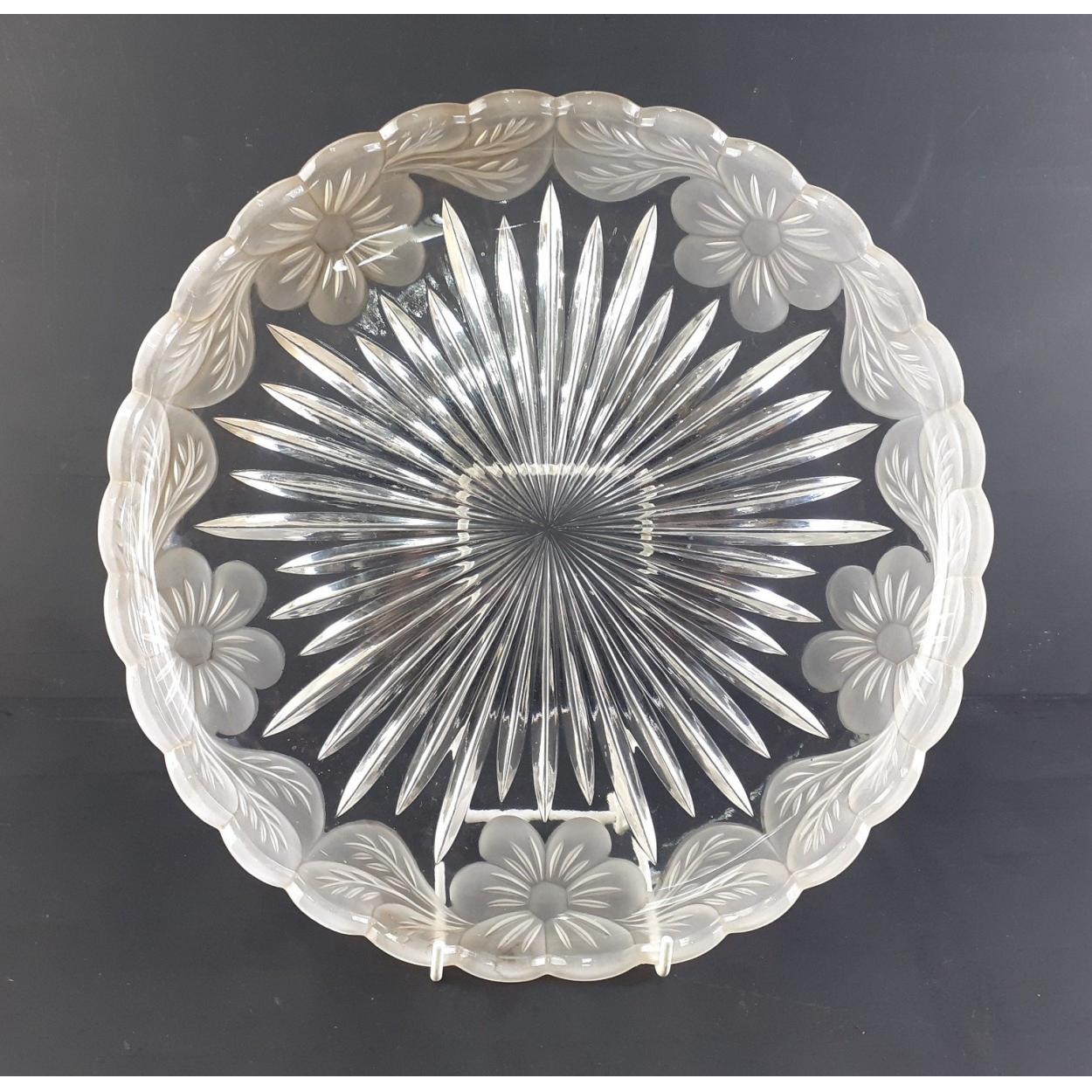 Attractive glass platter with etched edges. 31cm approx and in excellent condition.