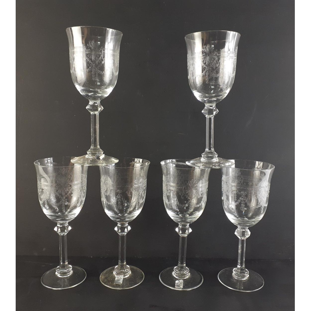 A super collection of various wine glasses with etched frosted floral design.