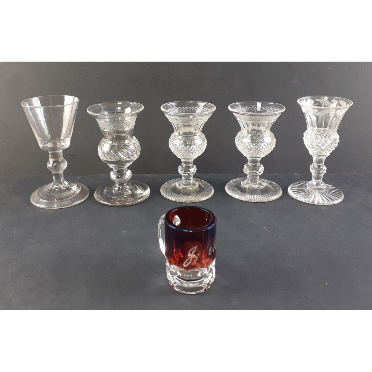 A super wee collection of five small liqueur glasses to include two thistle style one and other etched. An interesting little lot. Plus one Tiger's Eye cabochon approx 30mm in diameter.