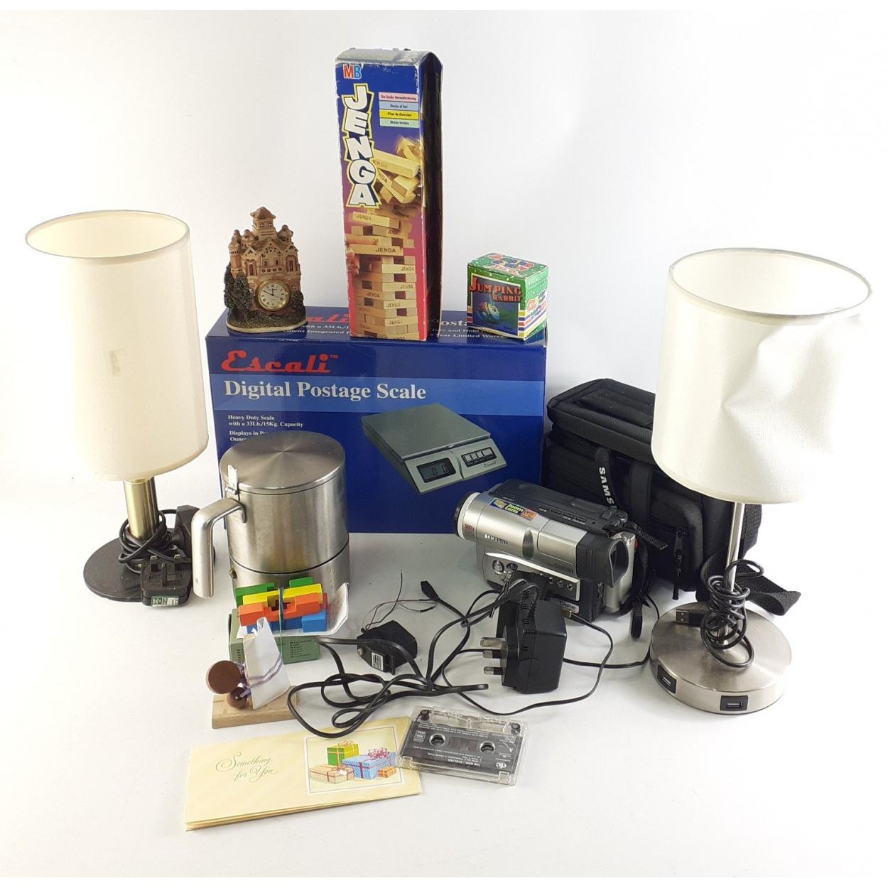 A mixed lot of homeware to include table lamps, digital postal scales, coffee pot, Samsung camcorder, clock, Jenga etc.