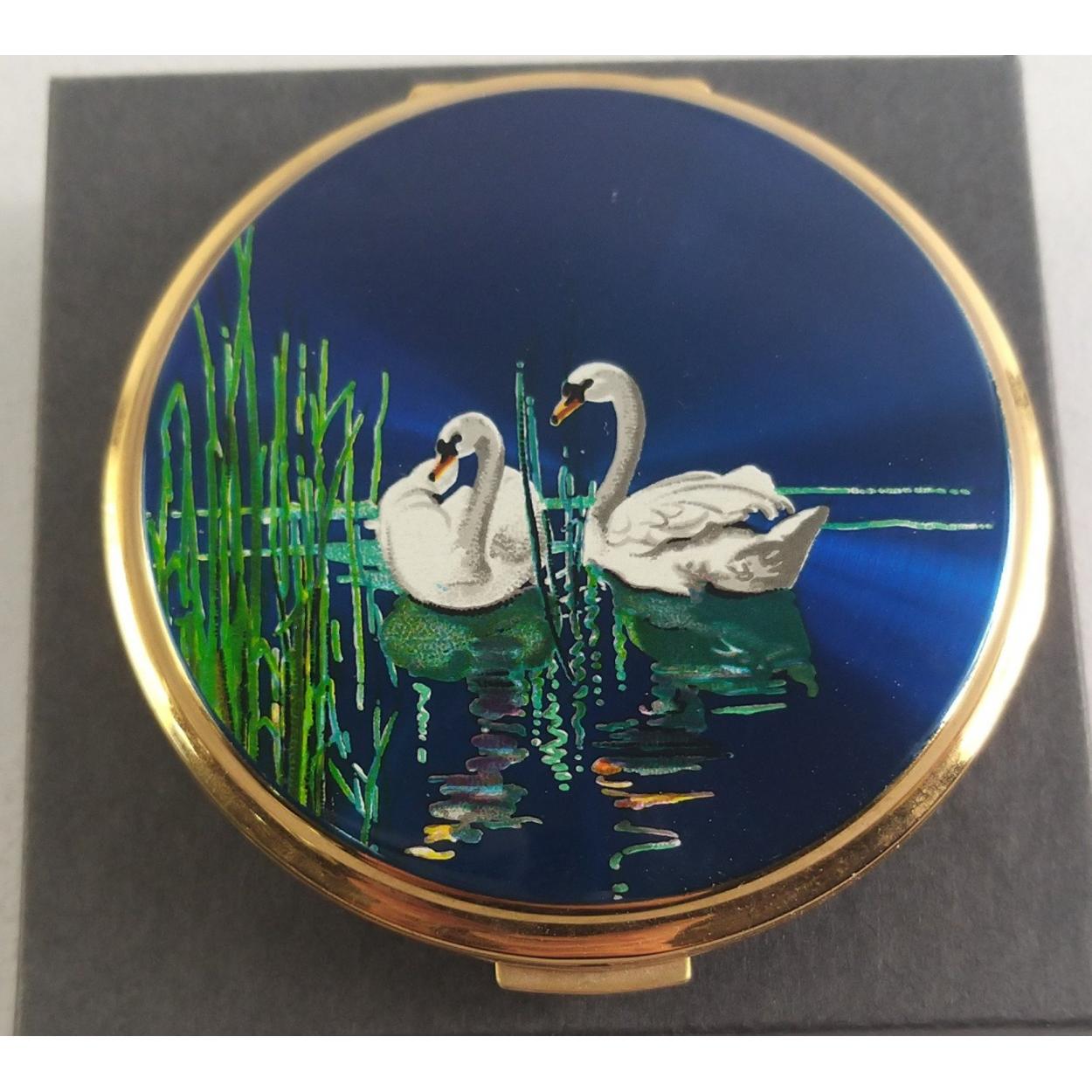 A sought after STRATTON enamel fronted powder compact with design of 2 swans. 80mm approx. Comes in box.