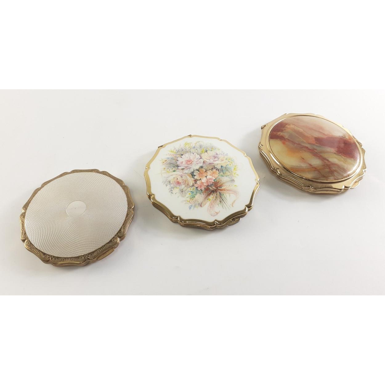 Three STRATTON powder compacts one with onyx effect cover, 90mm approx.