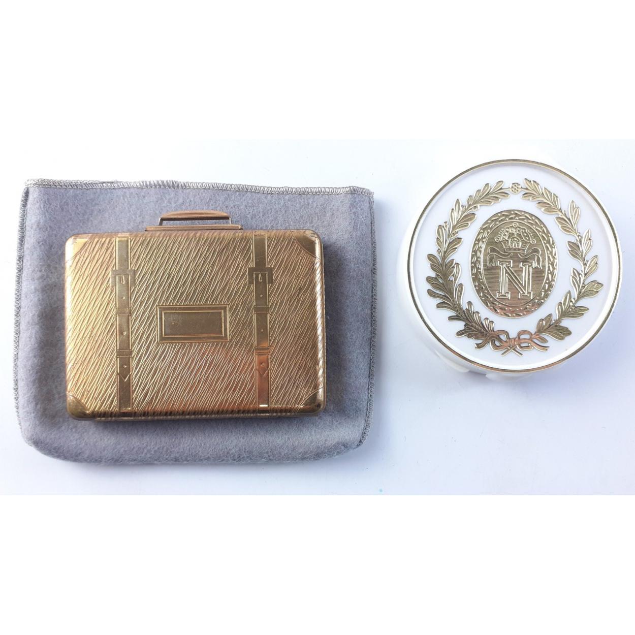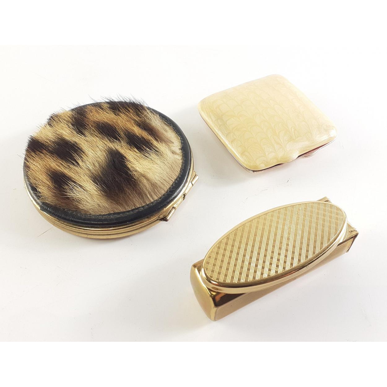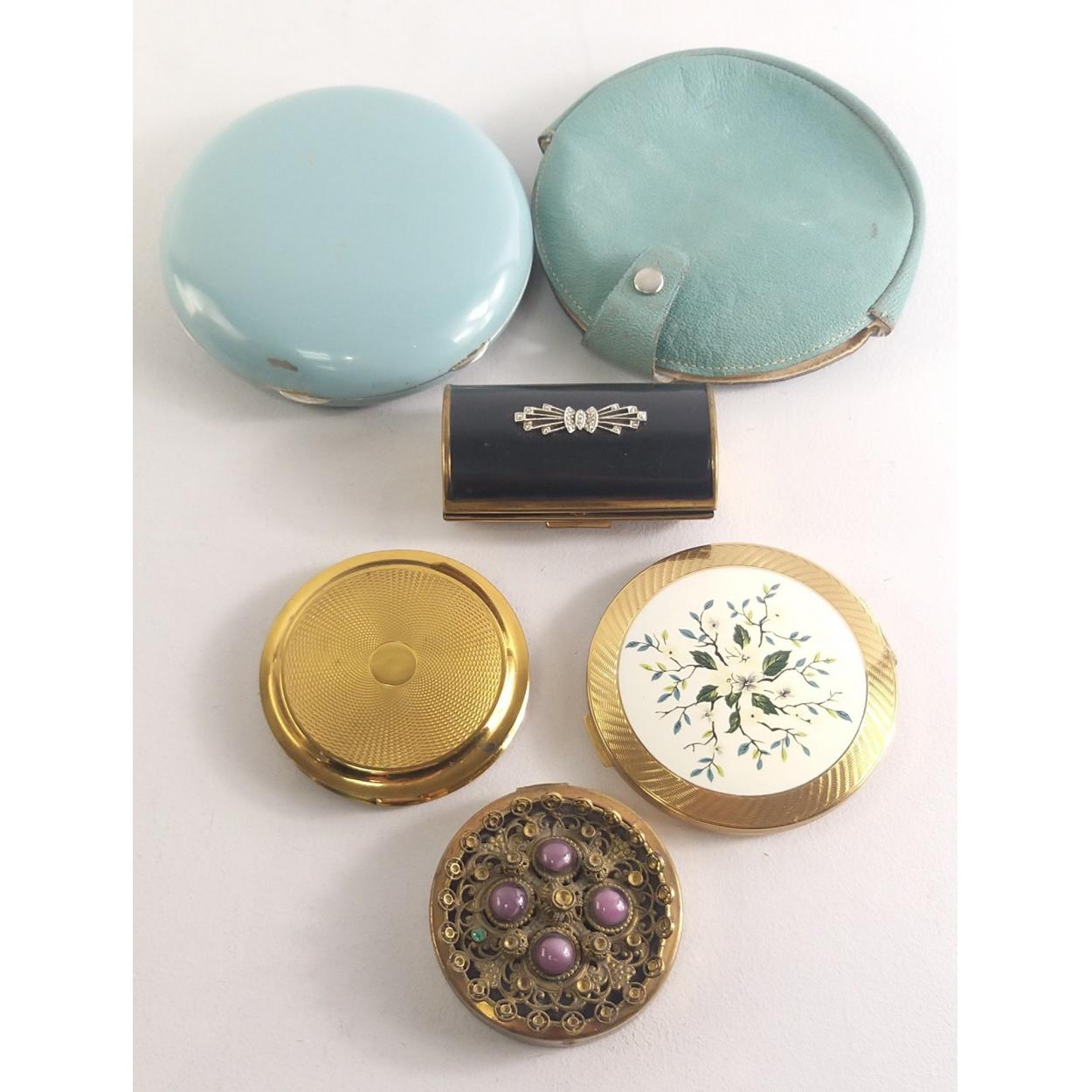 A large French compact with leather pouch plus 2 other compacts, a small decorated box (60mm approx) and one other container