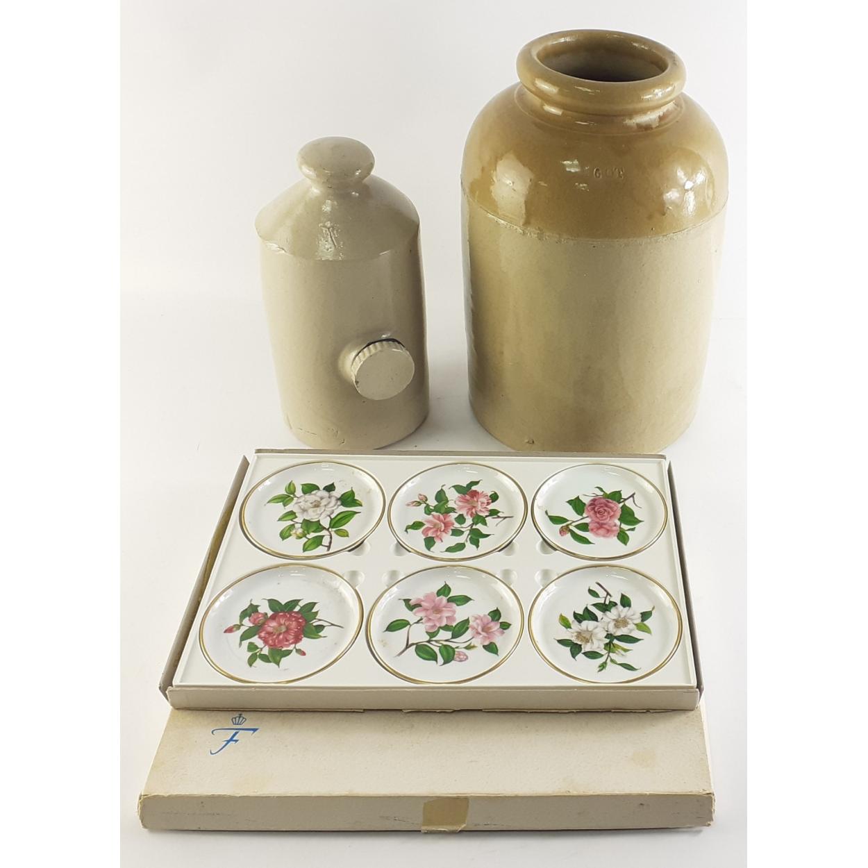 A stoneware jar and a stoneware water bottle and a set of six West German trinket dishes.