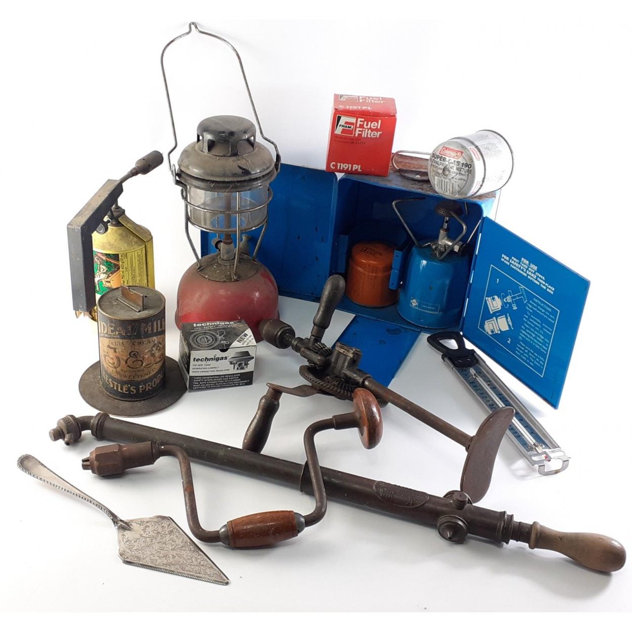 A box of interesting tools, a shed find! to include a Tilly Lamp, camping stove, Knee Brace and others.