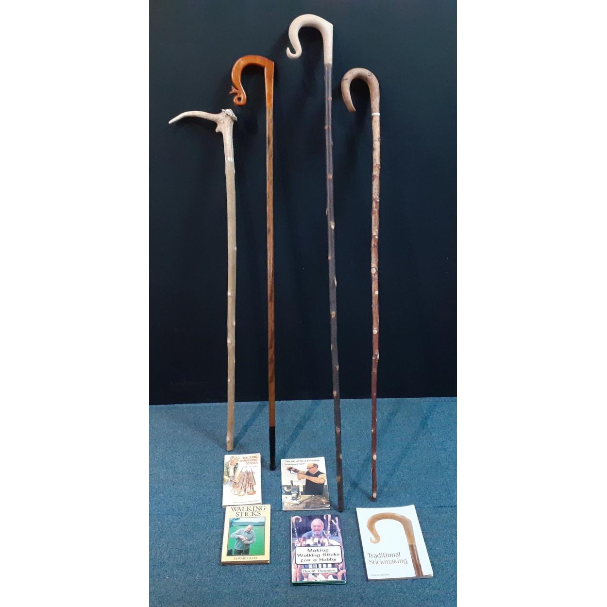 Four modern carved walking sticks / crooks. One with horn handle. One with a nice carving of a Fox to the handle. Also five volumes on sticks and stick making.