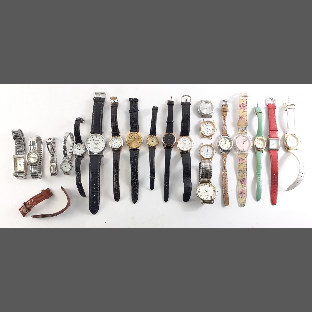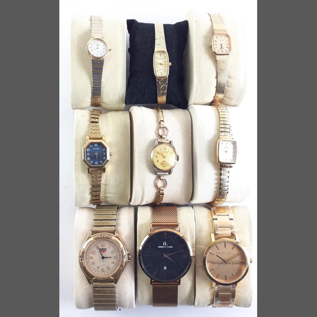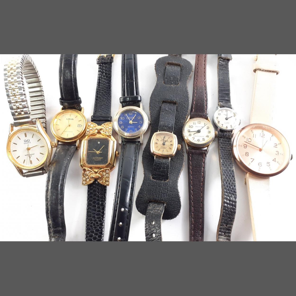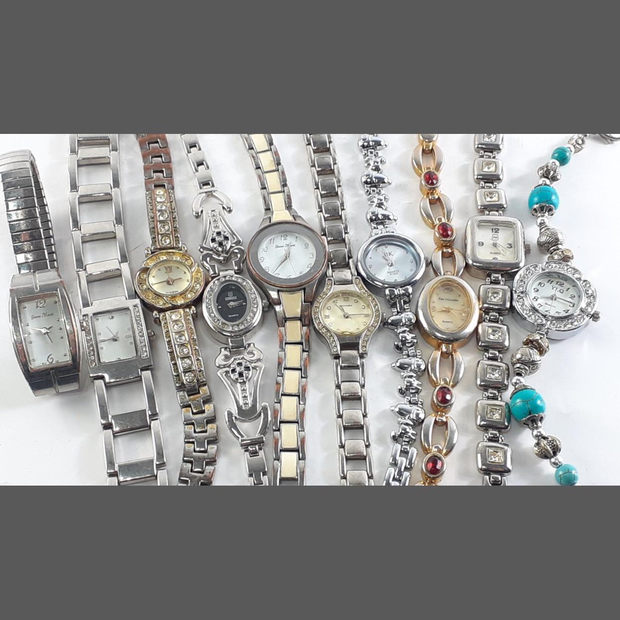 An interesting collection of ladies wrist watches, unchecked. Most will require batteries.