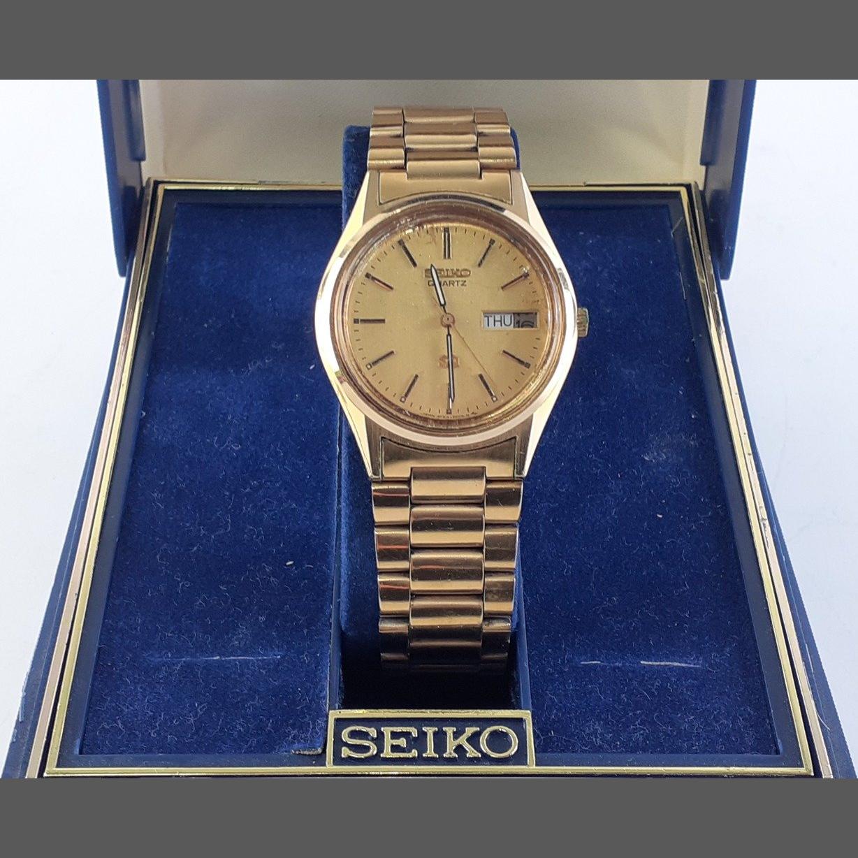 A boxed SEIKO 8C23-6000 Quartz watch from 1985 with spare link. Receipt from 1985. Not running, battery may be required.