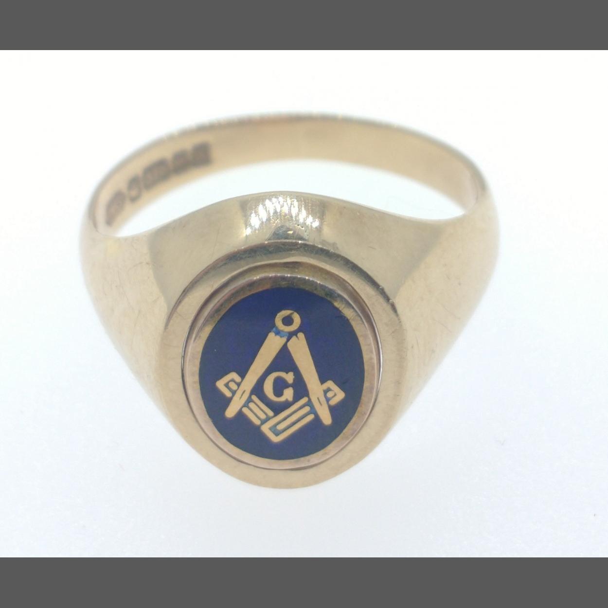 MASONIC INTEREST ! A NICE 375 stamped yellow gold MASONIC gents signet ring 5.31g weight gross approx with ‘swivel' faced Masonic emblem