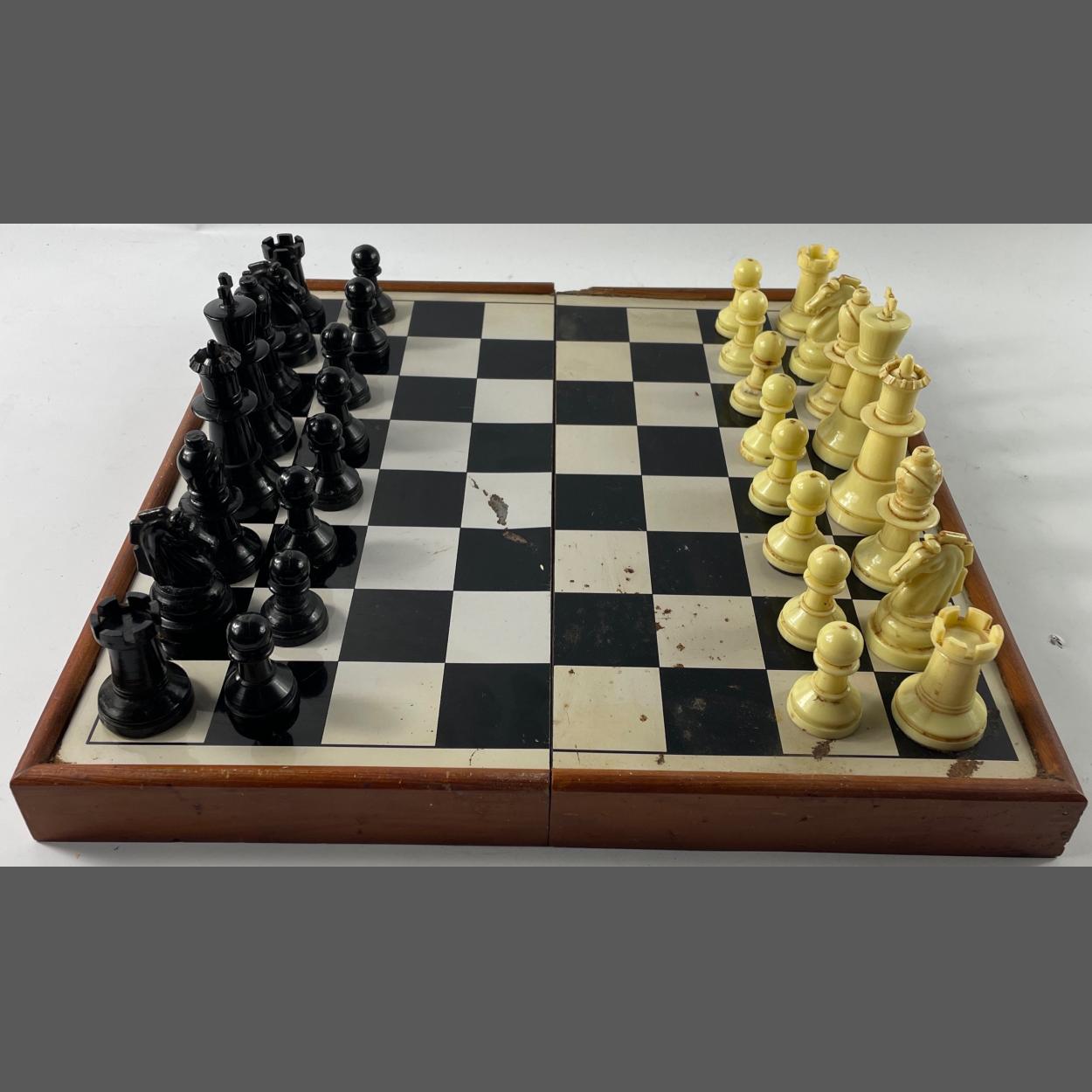 COMPLETE CHESS SET in a wooden box. Backgammon board inside. 38 x 36cm approx. Slight chip from one corner of box.