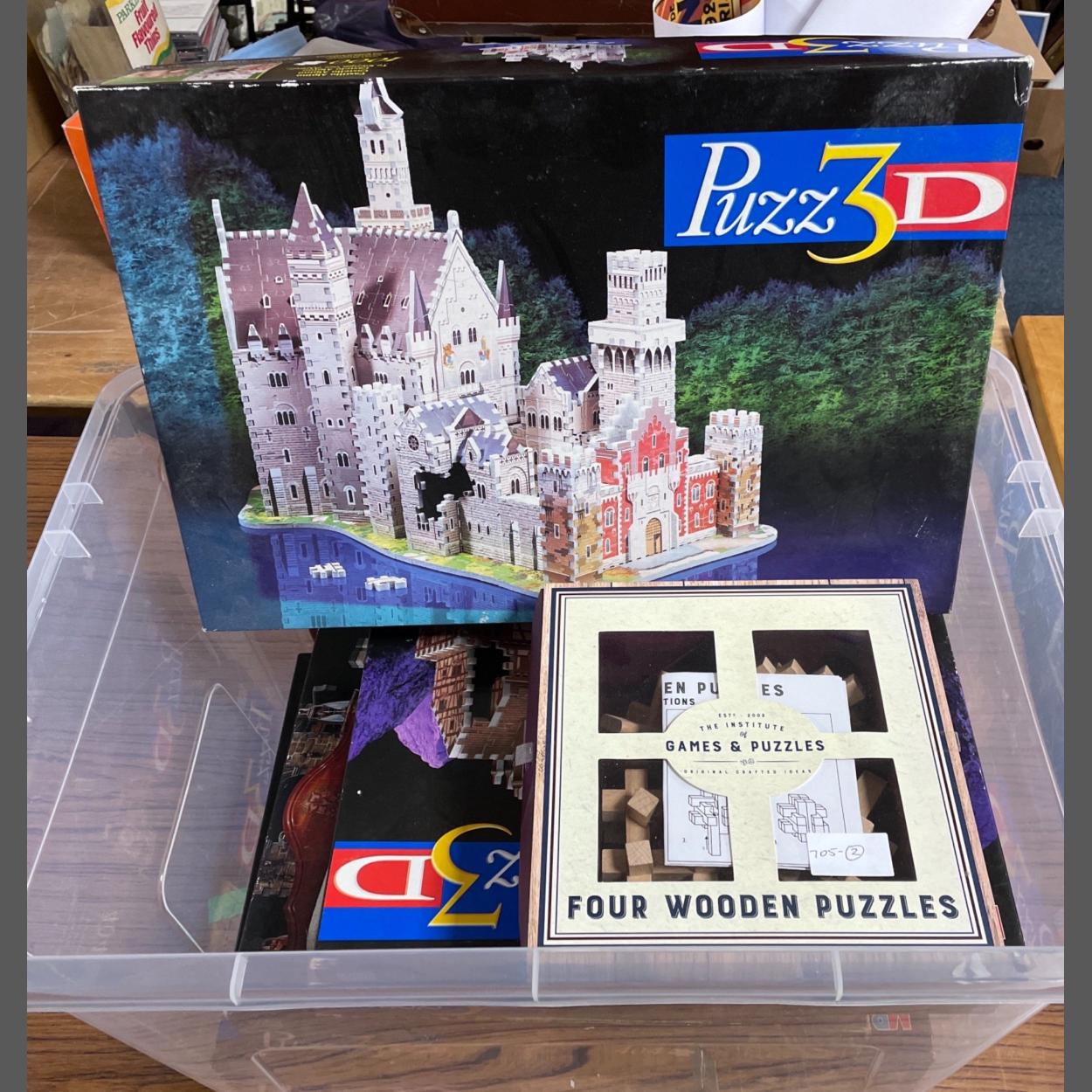 Four 3D PUZZLES to include the TAJ MAHAL, an ALPINE CASTLE, a BAVARIAN MANSION and a BAVARIAN CLOCK plus 4 wooden puzzles by the Institute of Games & Puzzles all contained within a sturdy lidded plastic box.
