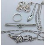 A collection of jewellery to include a Pendant with a clear stone on a 925 chain, a tiepin with a clear stone, a Scottish silver pendant and a pair of earrings. Silver gross weight 12gms. Ring size K/L