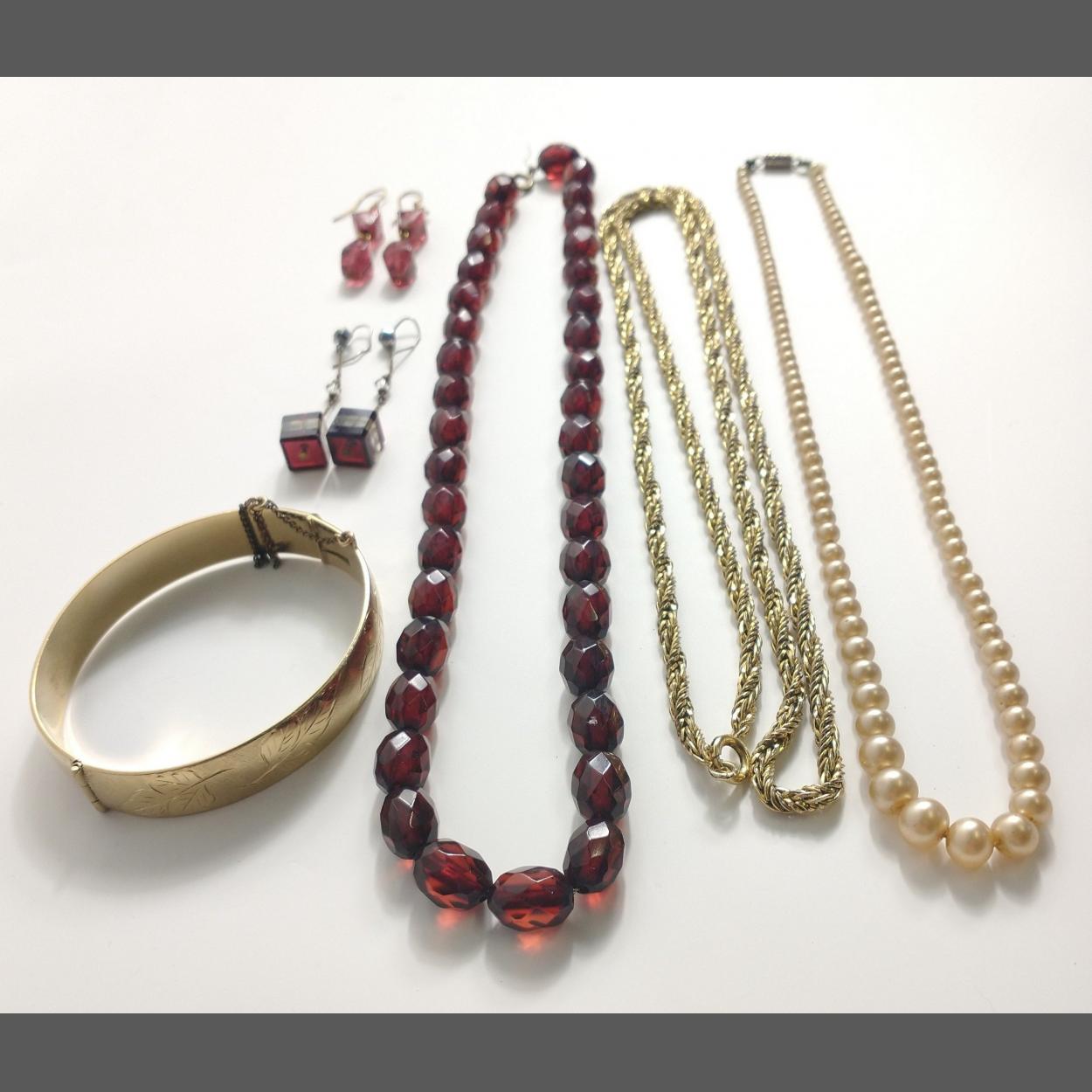 A hinged bracelet with safety chain stamped "9ct gold, metal core", plus a small collection of mainly costume jewellery to include necklaces and earrings.