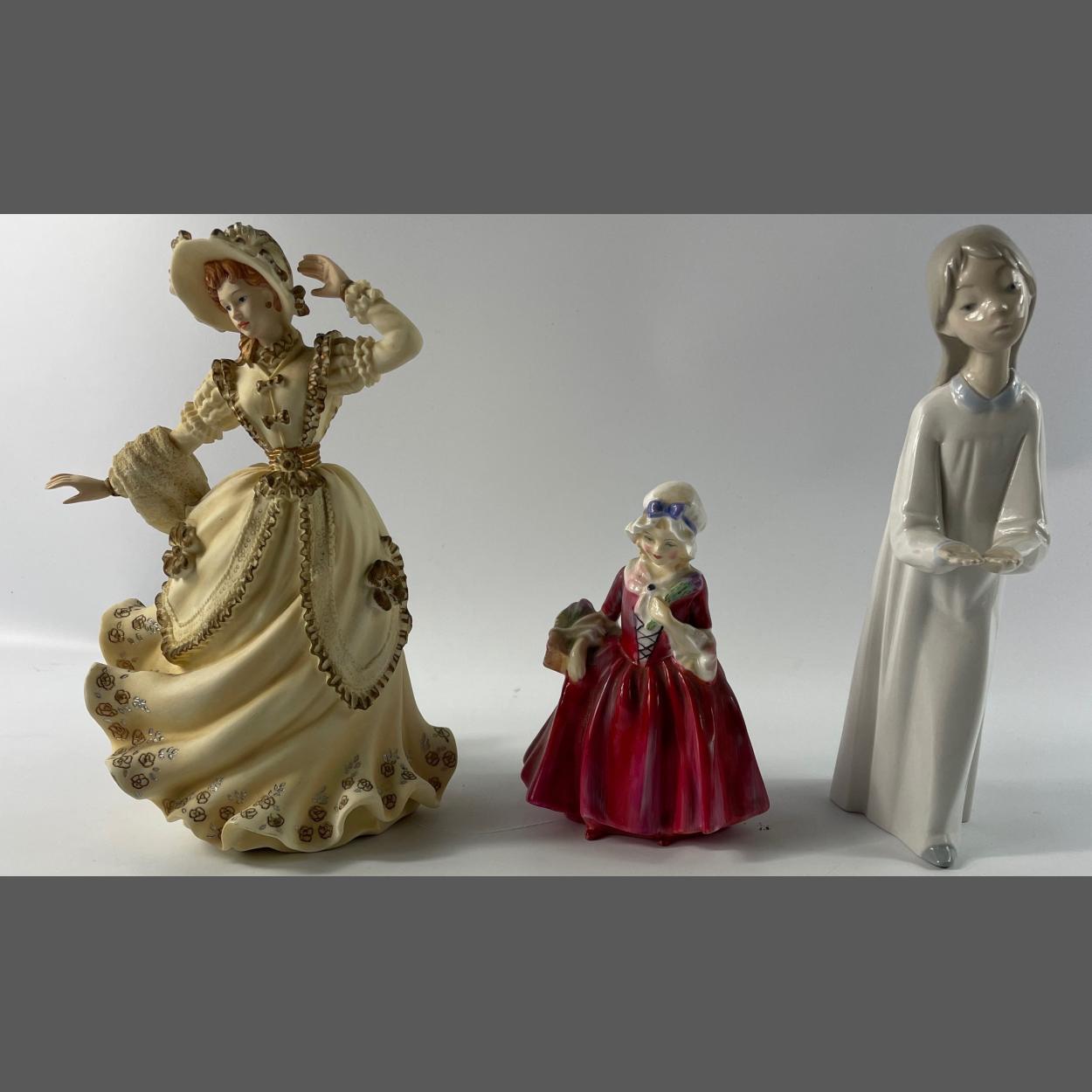 Small collection of lovely ladies to include ROYAL DOULTON "Lavinia" HN 1955 (approx. 13cm tall), LLADRO girl with hands out (approx. 20cm high) and "Winter Breeze" from the Leonardo Collection (approx 21cm tall)