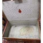 Large QUALITY leather trunk which has travelled some miles - it comes complete with 'Not wanted on voyage' stickers for London-Bombay. 90 x 55 x 30cm approx.