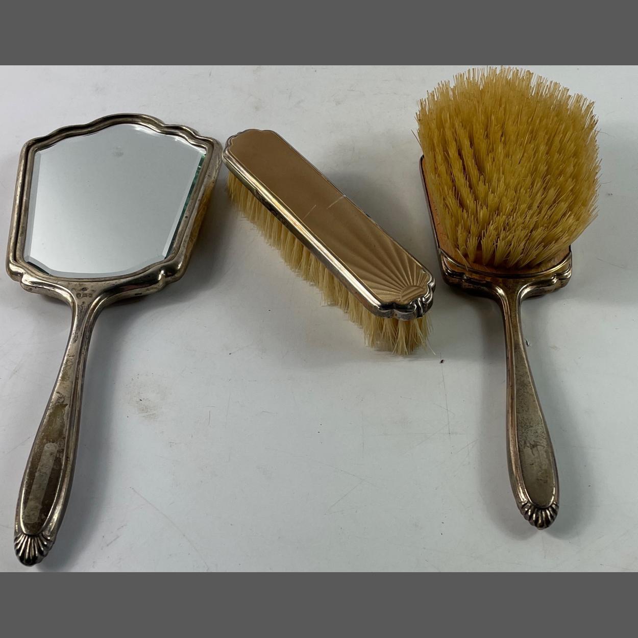 Vintage DRESSING TABLE SET consisting of EPNS hairbrush, hand mirror and clothes brush.