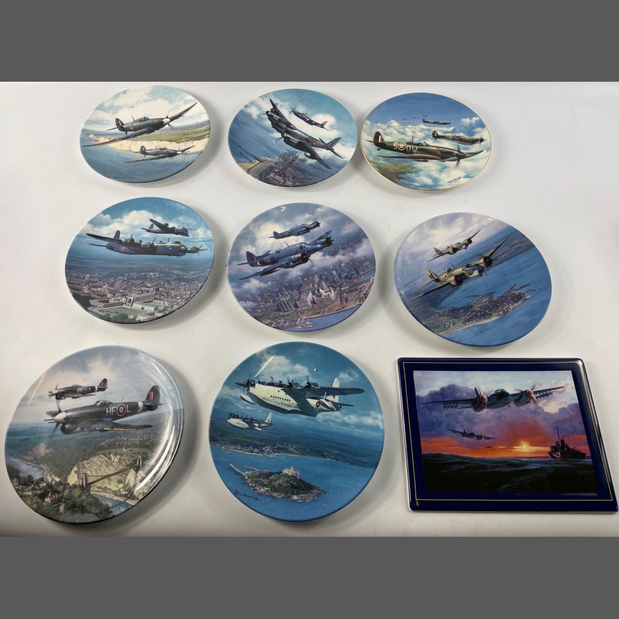 Collection of commemorative plates featuring WWll aircraft to include from the ROYAL DOULTON "In defence of the Realm" series: LANCASTERS OVER BEACHY HEAD, MOSQUITOS OVER THE FORTH BRIDGE, SPITFIRES OVER THE NEEDLES, HURRICANES OVER THE HOUSES OF PARLIAMENT, from the "heroes over home territory" series, SUNDERLAND OVER ST. MICHAEL'S MOUNT, BLENHEIM OVER HARWICH, HURRICANE OVER THE WHITE CLIFFS, MOSQUITO OVER BLACKPOOL TOWER, TYPHOON OVER CLIFTON SUSPENSION BRIDGE, BEAUFIGHTER OVER THE LIVER BUILDING, STIRLING OVER LING'S COLLEGE, CAMBRIDGE, from the COALPORT " the power and the glory" series SPITFIRES IN VIC THREE FORMATION and from the DAVENPORT "Vigilant shores" series STRIKE WING.
