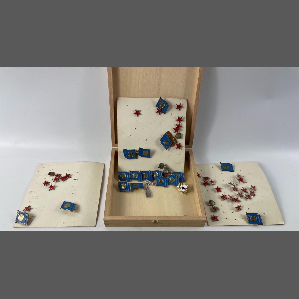 Interesting cigar box collection of lapel pins including the red star of the USSR, the Freie Detsche Jugend (German Free Youth) plus some possibly depicting Lenin.