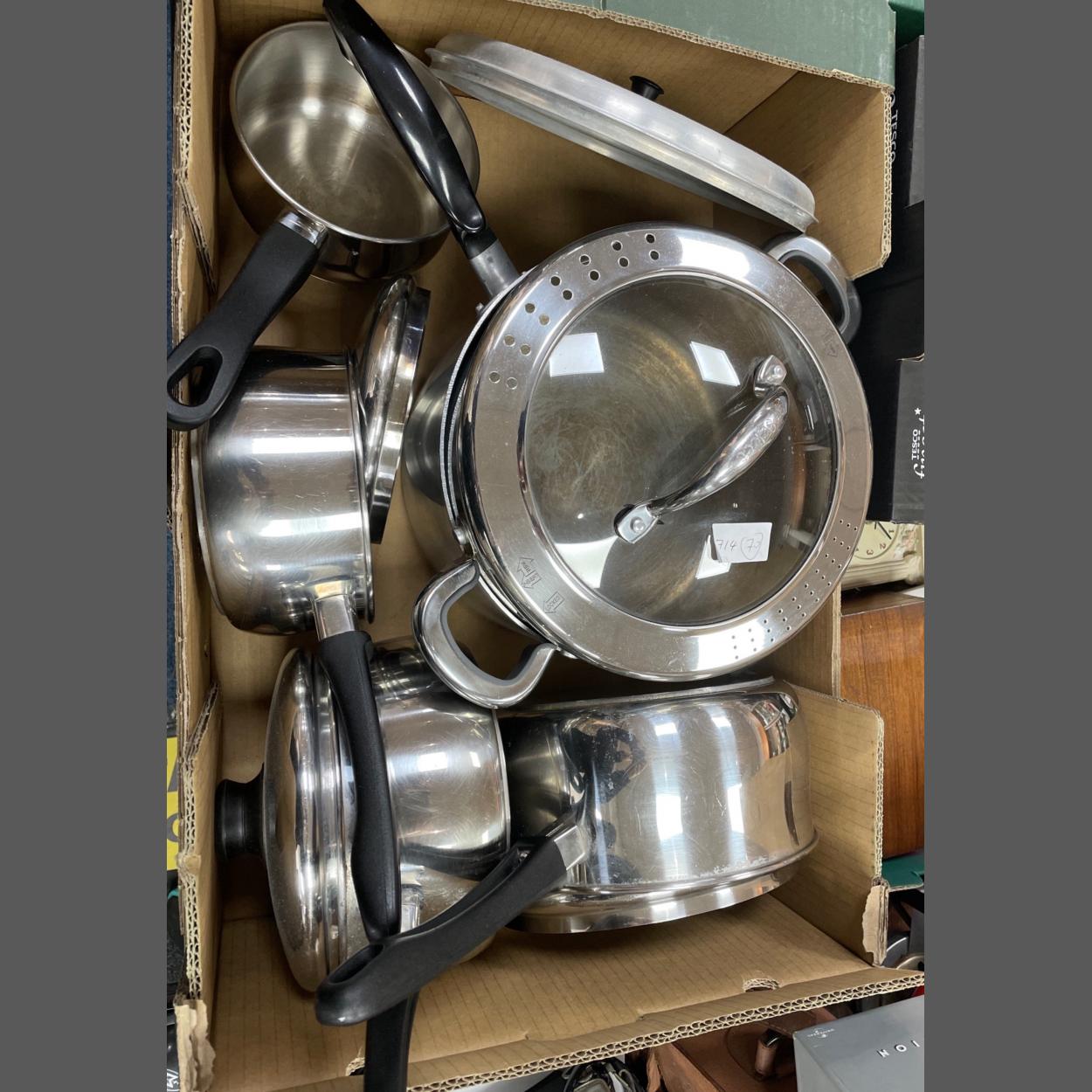 A box FULL of SIMPLY FABBY stainless steel pots and pans in good clean condition some new condition to include brand names like MEYER. Etc