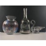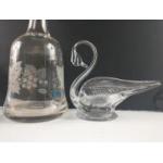 DECORATIVE GLASSWARE. A bell shaped decanter approx. 27cm tall plus a vase approx. 17cm tall with a floral pattern in red and blue and a crystal swan bowl.