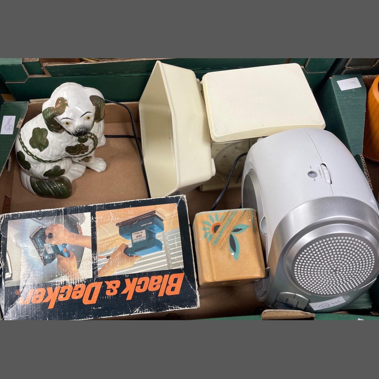 A mixed lot to include a PHILIPS CD player, a large set of kitchen scales with pan, and a BLACK AND DECKER SANDER etc