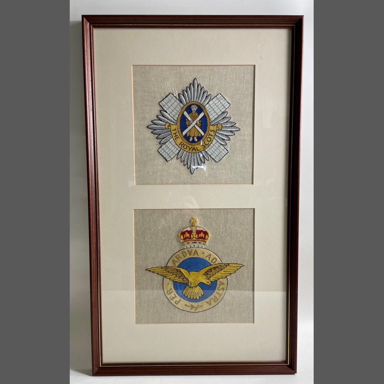 HIGHLY UNUSUAL hand-embroidered emblems of THE ROYAL SCOTS and THE RAF in bespoke frame 62 x 37cm approx.