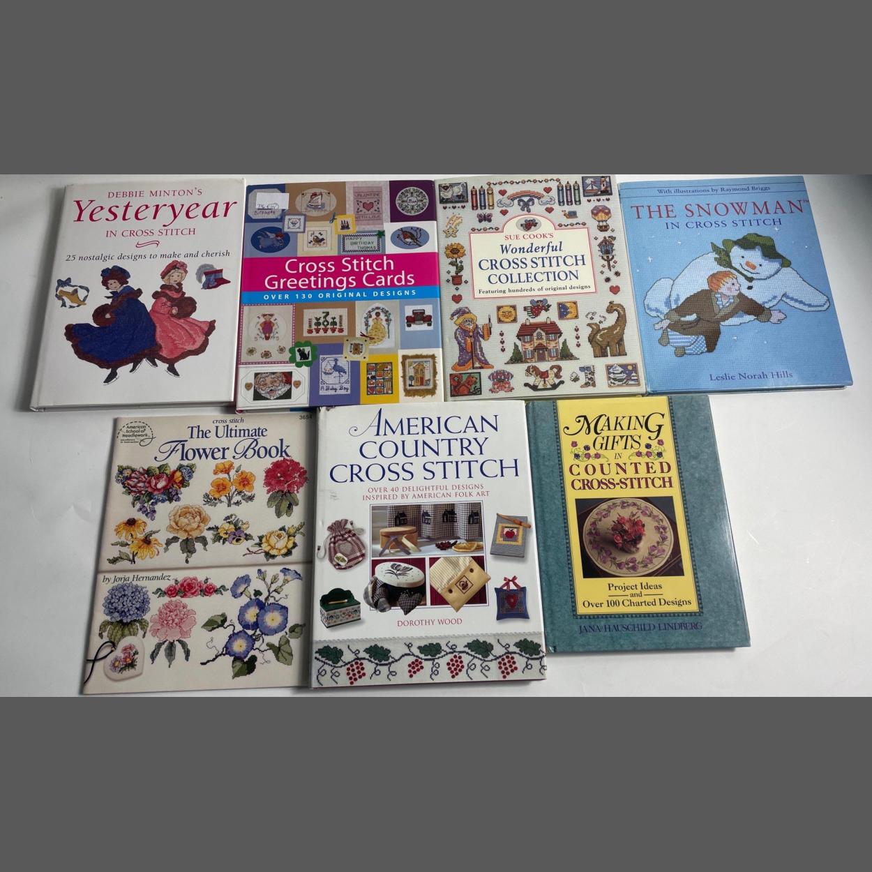 Cross stitch pattern books to include MAKING GIFTS IN COUNTED CROSS STITCH, AMERICAN COUNTRY CROSS STICTH, YESTERYEAR IN CROSS STITCH, CROSS STITCH GREETINGS CARDS, THE SNOWMAN IN CROSS STITCH by Leslie Norah Hills, Sue Cook's WONDERFUL CROSS STITCH COLLECTION, THE ULTIMATE FLOWER BOOK by Jorja Hernandez. All in excellent condition.