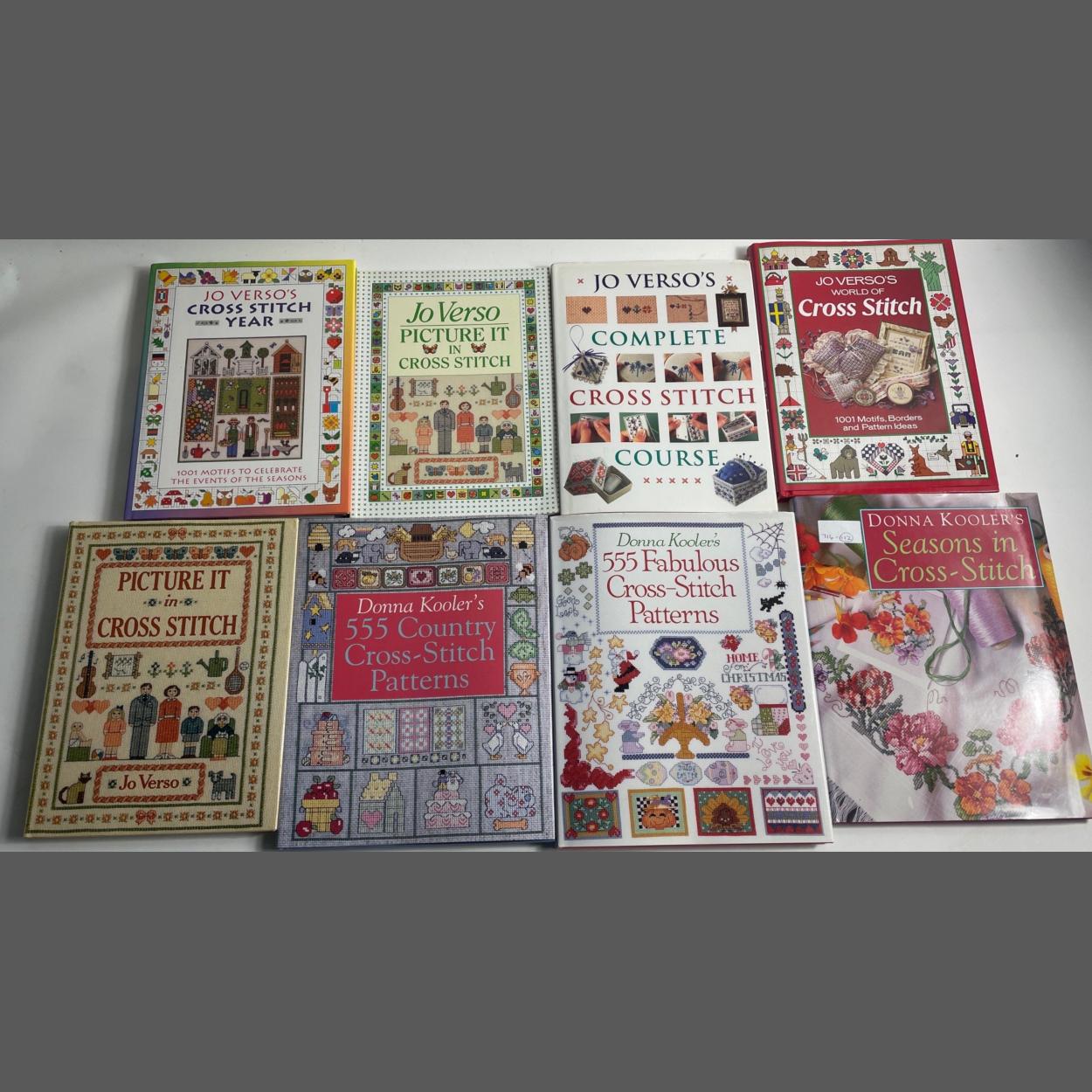 JO VERSO pattern books to include the COMPLETE CROSS STITCH COURSE, PICTURE IT IN CROSS STITCH, WORLD OF CROSS STITCH, CROSS STITCH YEAR also Donna Kooler's 555 COUNTRY CROSS STITCH PATTERNS, Donna Kooler's 555 FABULOUS CROSS STITCH PATTERNS and Donna Kooler's SEASONS IN CROSS STITCH. All in excellent condition.