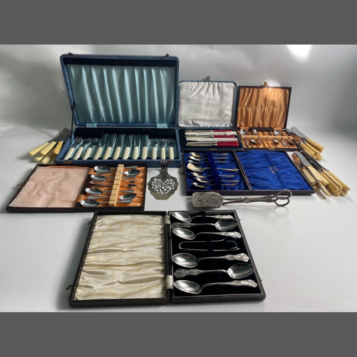 Collection of cutlery to include 6 canteens and selection of loose cutlery. To include 2 complete teaspoon and sugar tongs (Noells Albaloid and unnamed), unusual flower cross design teaspoon and sugar scoop canteen (unmarked but comes in Arthur Eaton, Innerleithen canteen), incomplete canteen with 6 teaspoons (not marked), canteen of unmarked red handled butter knives (2 with paper protections), complete canteen with white handle fish forks and knives, collection of various maker of similar style table knives, EP cake slice and EP cake tongs