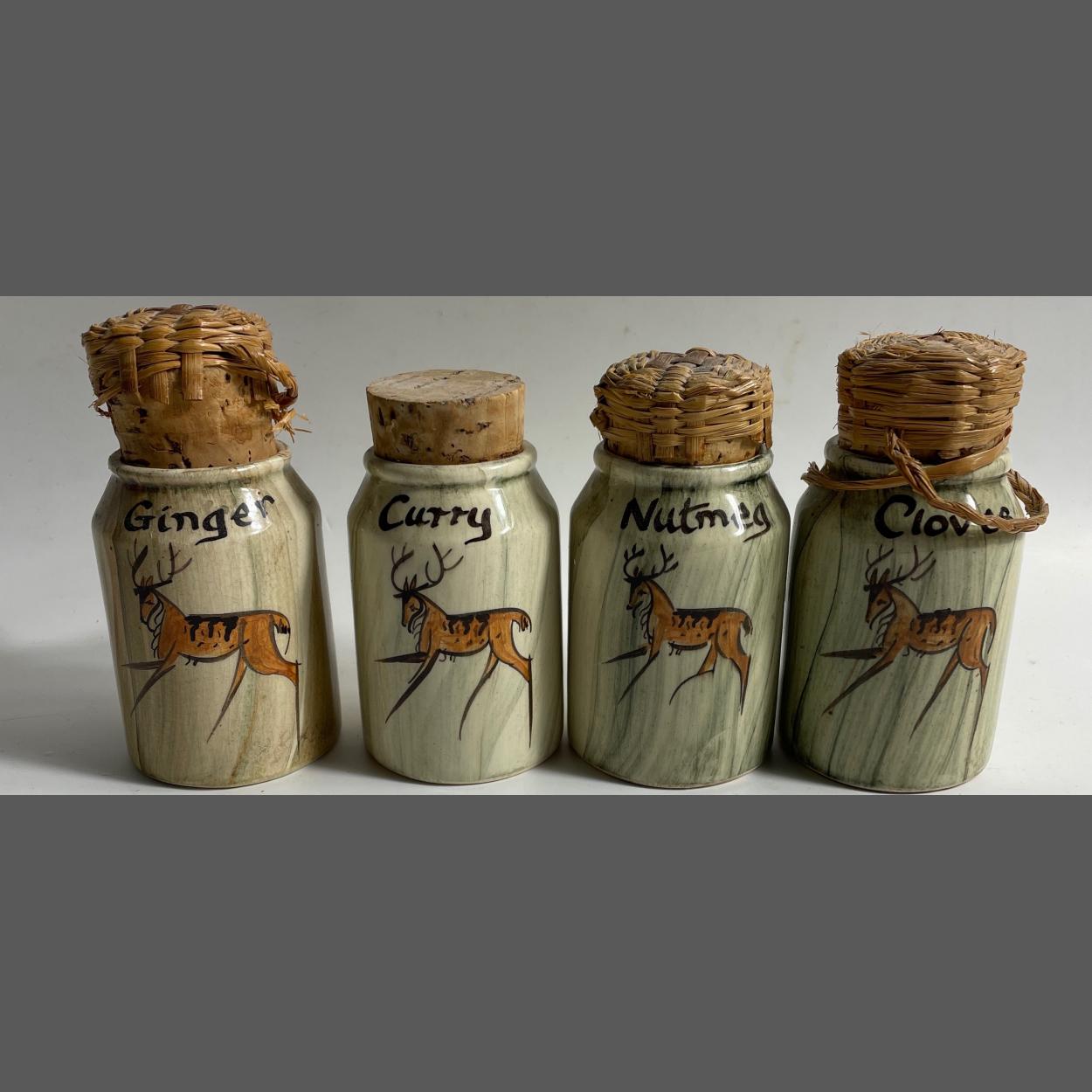 VINTAGE & UNUSUAL! Four oynx effect china kitchen storage jars 'Curry', 'Nutmeg', 'Cloves' and 'Ginger' with deer motif. All with cork stoppers, 1 missing woven covering