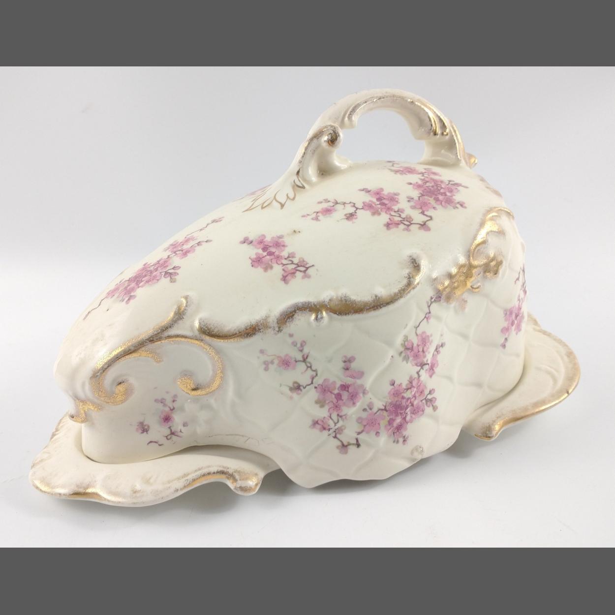 EXQUISITE late 19th century glazed pottery LARGE hand painted cheese dish with lid, total length 28cm approx. No maker's mark but just OOOZES QUALITY!
