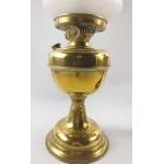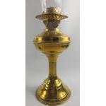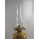 Two brass-effect oil lamps, one with shade both with chimneys approx. 50cm each.