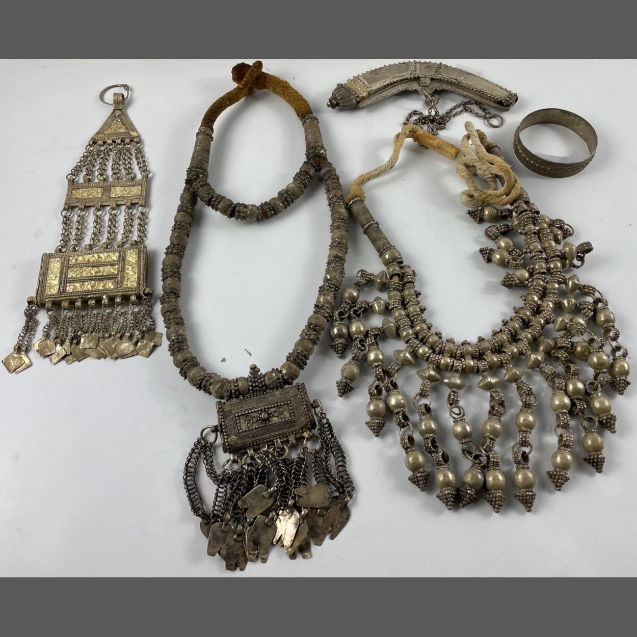 BEDOUIN traditional jewellery to include two large necklaces, a KOHL pendant, a bracelet, and a gun powder horn