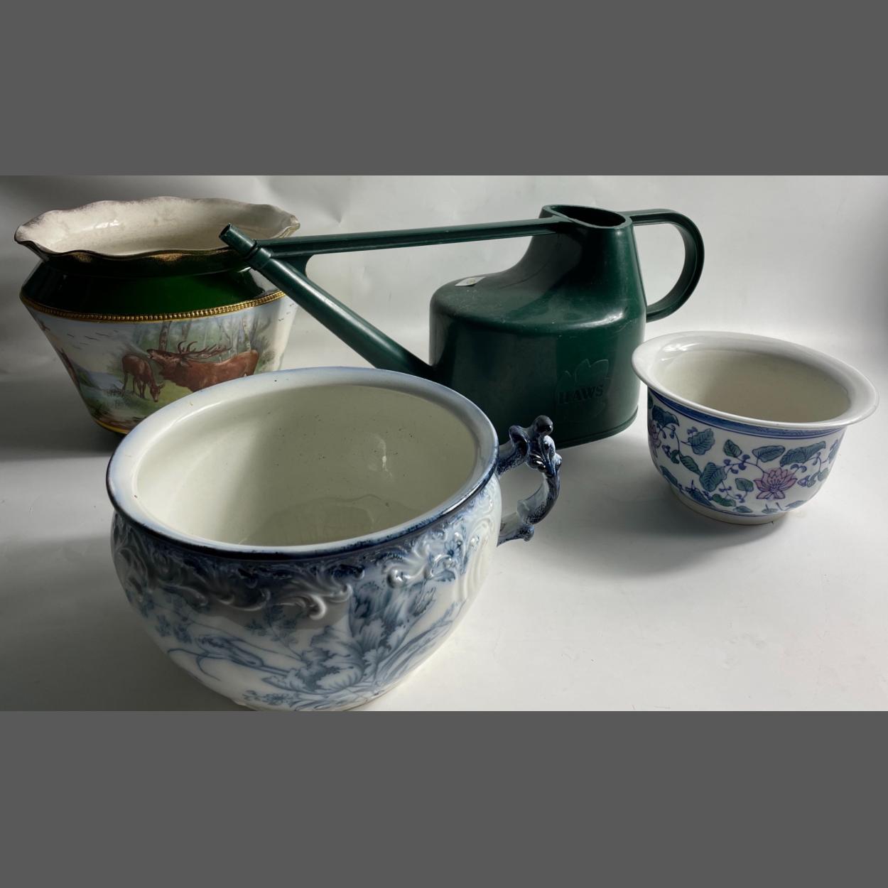 Plant essential - box with watering can rather fine chamberpot plant pot plus 2 others.