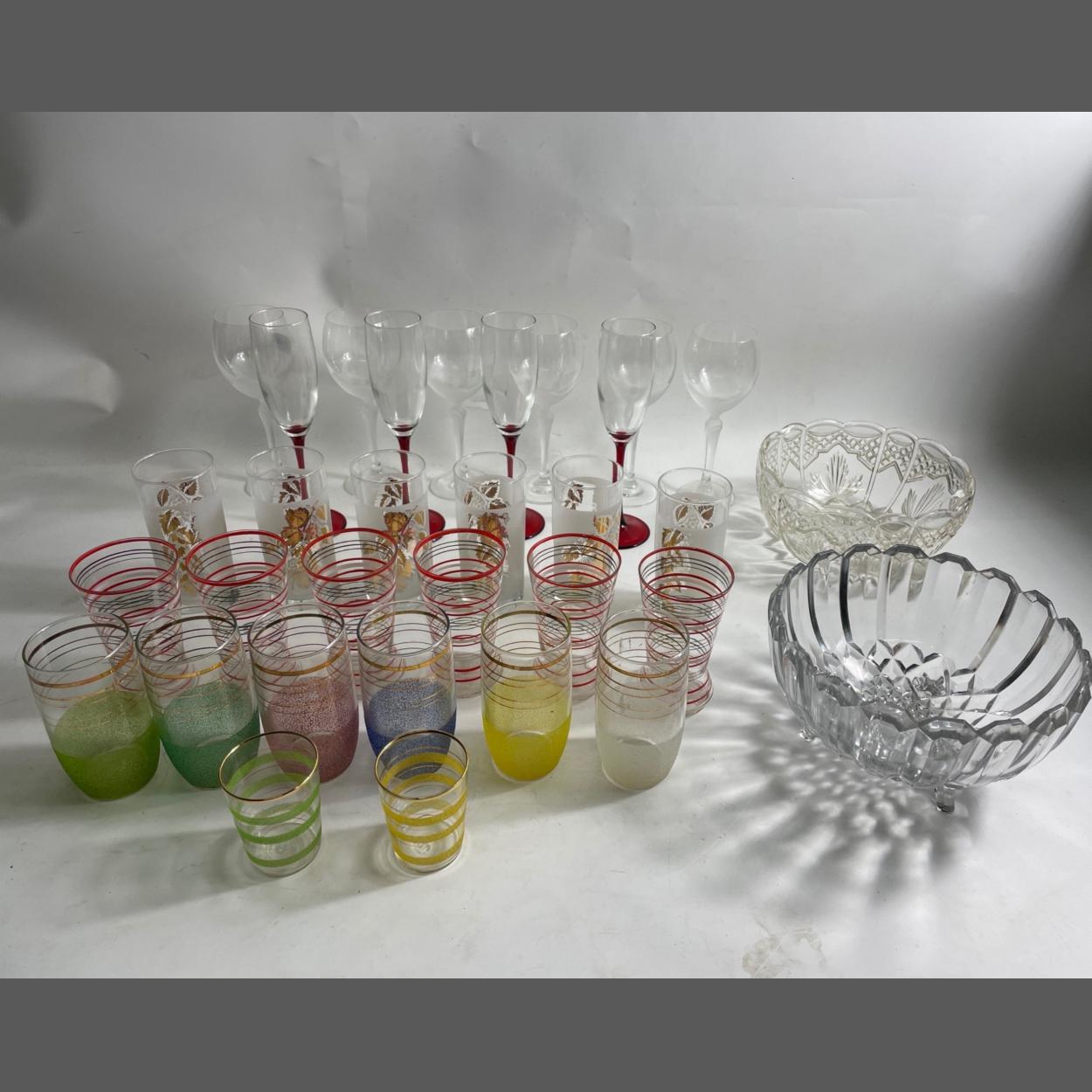 A box FULL of drinking glasses and some rather nice CHAMPAGNE flutes etc etc with two nice VINTAGE PRESSED GLASS FRUIT BOWLS