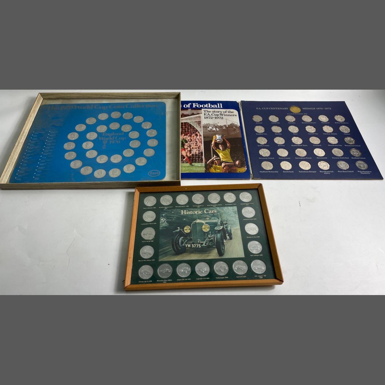 ENGLAND WORLD CUP ESSO coin collection 1970 card, also a FA CUP CENTENARY 1972 medal card collection and a framed COLLECTORS HISTORIC CARS Token card set AND AN ESSO 22 SOCCER SUPER STARS COLLECTORS CARD