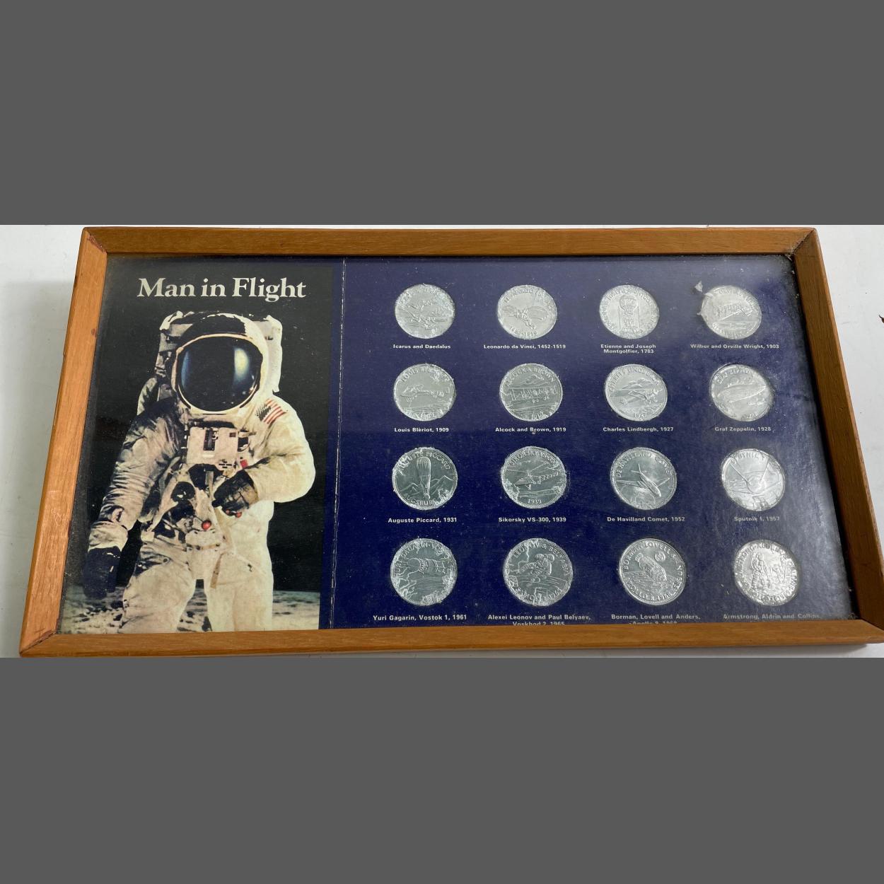 COLLECTABLE FRAMED MAN IN FLIGHT token coin set complete c1970's