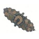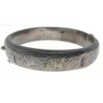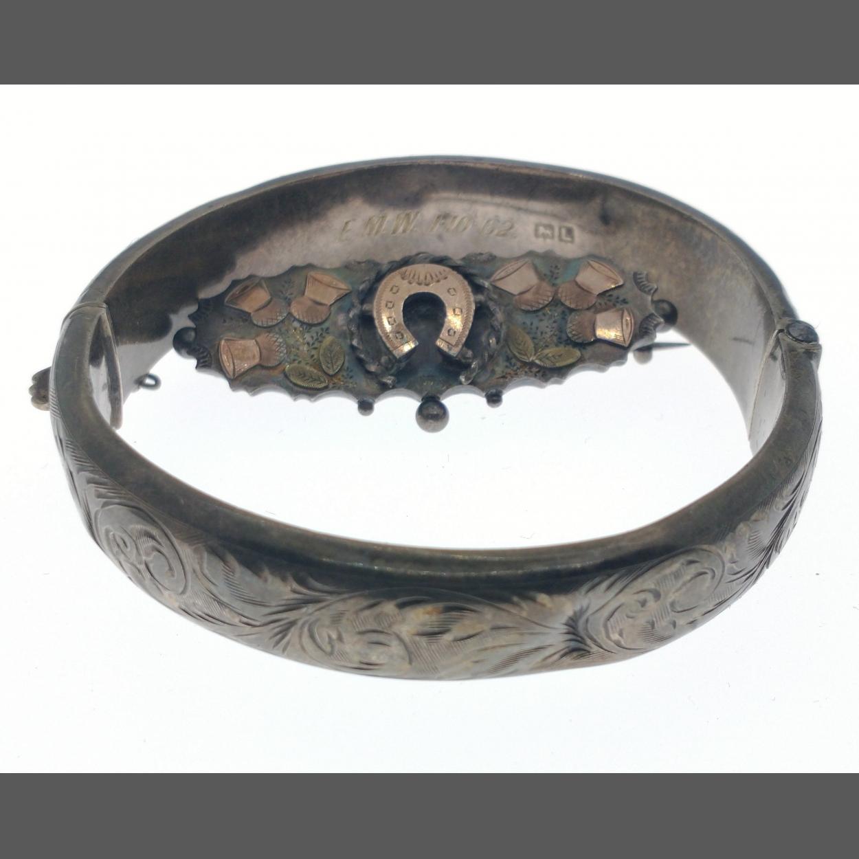 A SILVER HALLMARKED snap shut bracelet c1962 with a SILVER BIRMINGHAM stamped brooch decorated with horseshoes and thistles in copper gross weight 4.75g