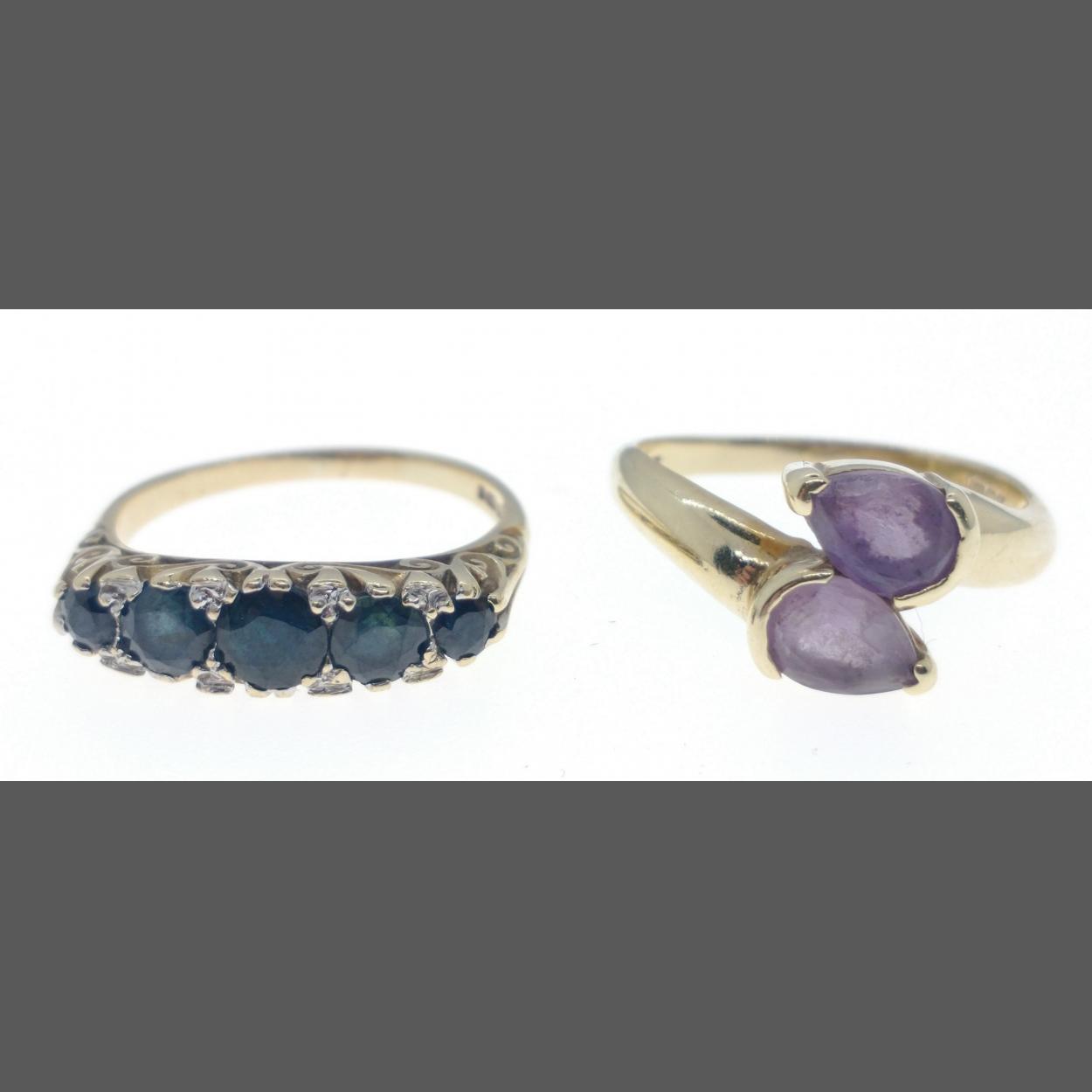 IMPRESSIVE Lady's ring with 5 sapphires size P hallmarked 375, gross weight 3.3gms and the other with 2 amethyst coloured stones size P hallmarked 375, gross weight 2.8gms.