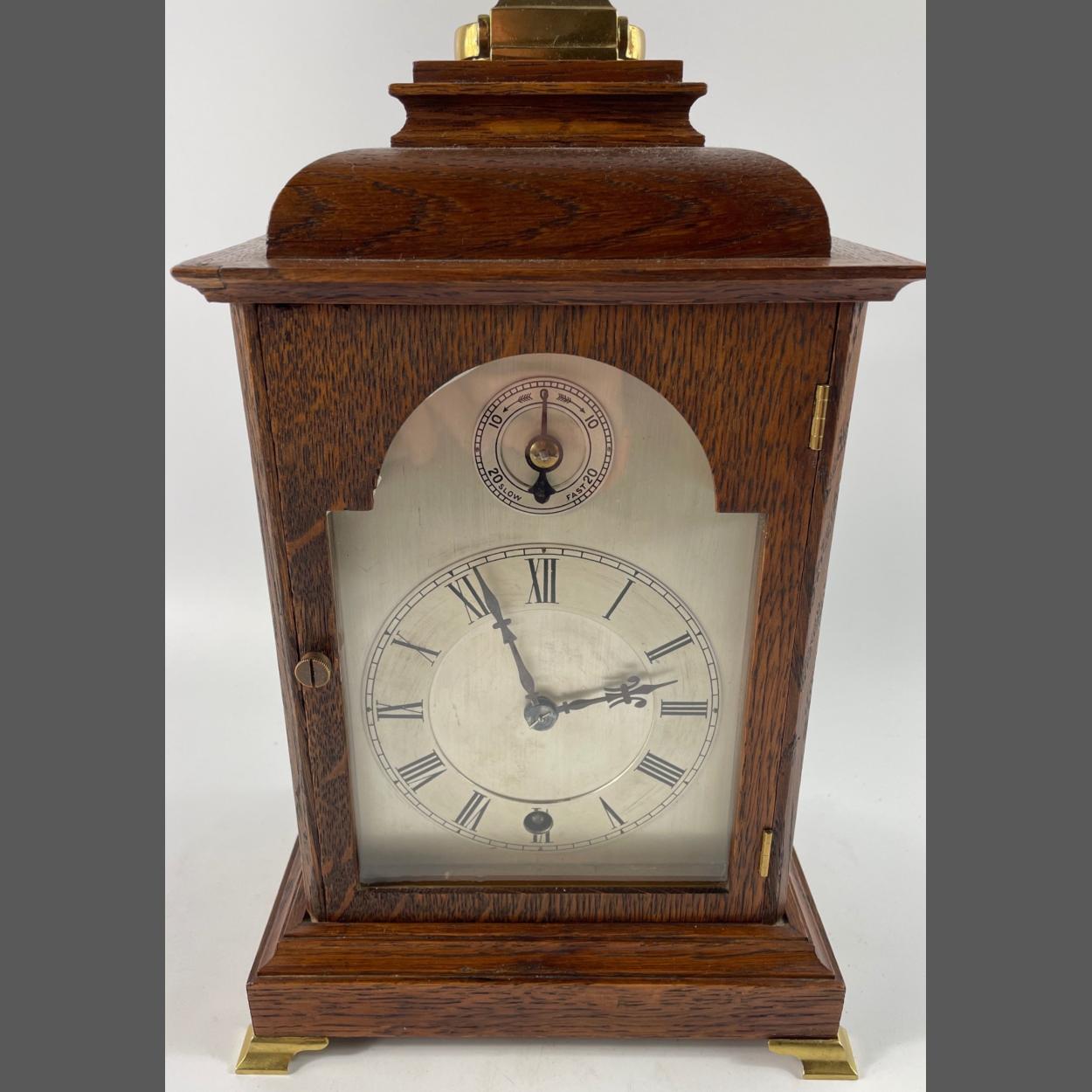 EARLY 20TH CENTURY OAK CASED GLASS MANTLE CLOCK WITH A GOOD QUALITY WINTERHALDER & HOFMEIER SCH MOVEMENT(One of the top German quality clock makers) - clock is in working order and the case is in a good clean state! Dimensions Height 33cm x 19cm width x 13.5cm - The clock has its original winding key